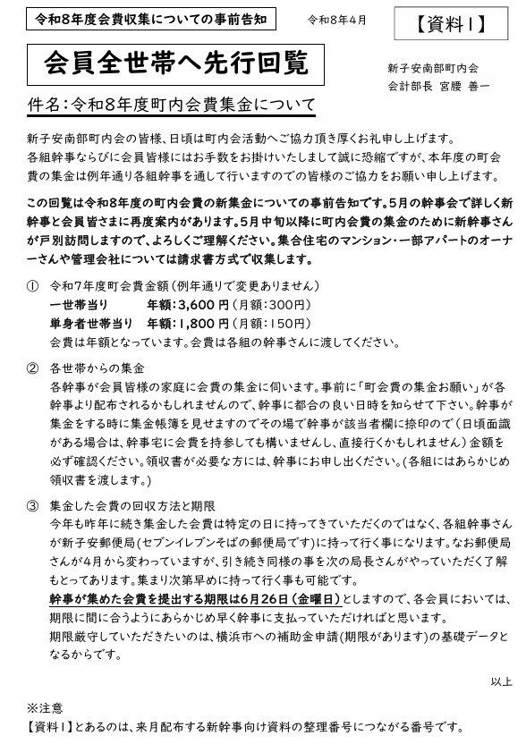 今月は、横浜市の地域活動費の1世帯あたりの補助金が増額されたため、会員全員への情報告知と承認がありますので、必ず回覧をお読みください。また7月の南部祭りの件などもありてんこ盛りです。