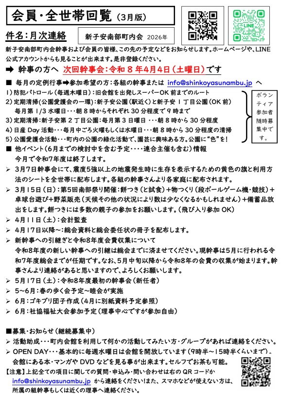 今月は、横浜市の地域活動費の1世帯あたりの補助金が増額されたため、会員全員への情報告知と承認がありますので、必ず回覧をお読みください。また7月の南部祭りの件などもありてんこ盛りです。