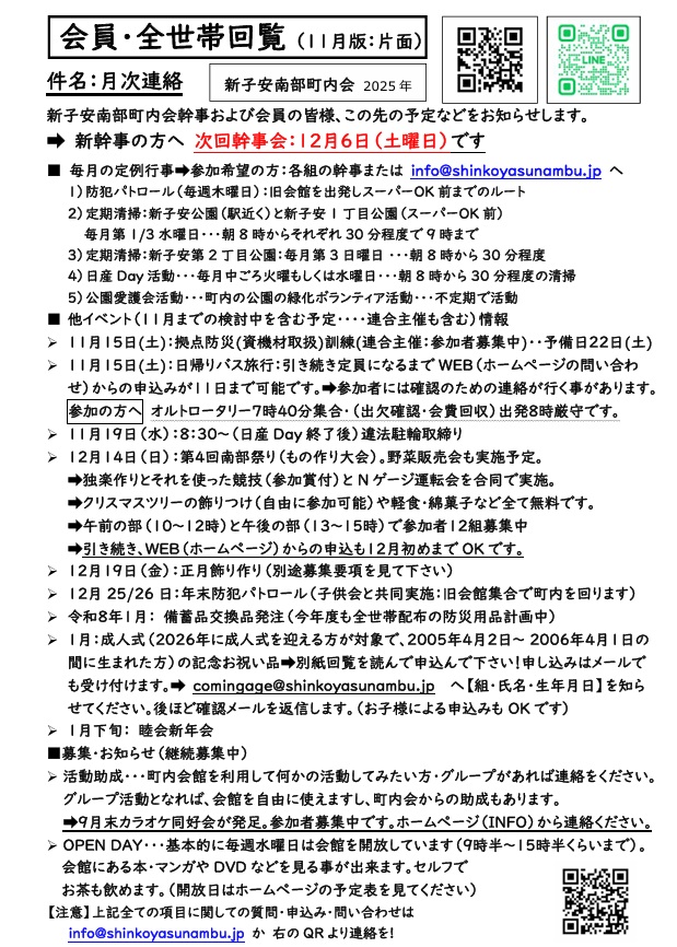 11月幹事会の資料を以下の通り配布します。 LINE公式アカウントにもUPしていますので、この際友達登録してください。